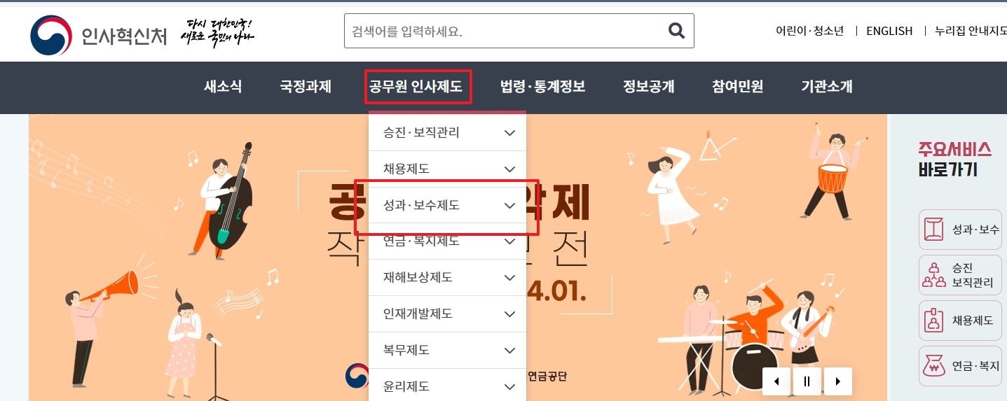 인사혁신처 홈페이지에 들어갑니다. 이 홈페이지는 공무원 인사정책의 수립, 혁신, 채용, 인사관리, 급여, 연금, 인재개발, 복무, 윤리, 소청 등 중앙행정기관의 다양한 업무를 관장하는 중요한 플랫폼입니다. 이곳에서 공무원들의 인사제도와 관련된 전반적인 정보를 확인할 수 있습니다.