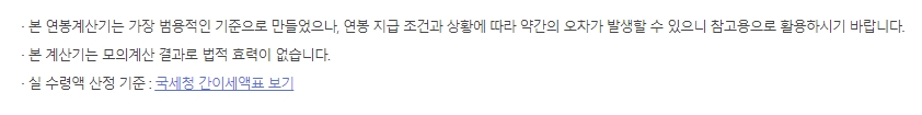 이 연봉계산기는 가장 일반적인 상황을 기준으로 설계되었으나, 실제 연봉 지급 조건과 개인의 상황에 따라 결과에 약간의 오차가 발생할 수 있습니다. 따라서 이 계산 결과는 참고용으로만 활용하시고, 실제 실수령액을 알아보려면 국세청의 간이세액표를 참고하거나 전문가의 조언을 구하는 것이 좋습니다. 이 계산기는 모의계산 결과이며 법적 효력이 없음을 기억해야 합니다.