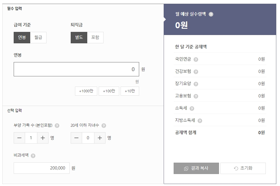 연봉계산기를 사용할 때, 대략적인 금액만 알고 싶다면 선택 입력 사항은 기본 설정으로 두고 연봉 금액만 입력하면 됩니다. 이렇게 하면 복잡한 추가 정보 입력 없이도 간단하게 연봉에 대한 계산을 진행할 수 있습니다.