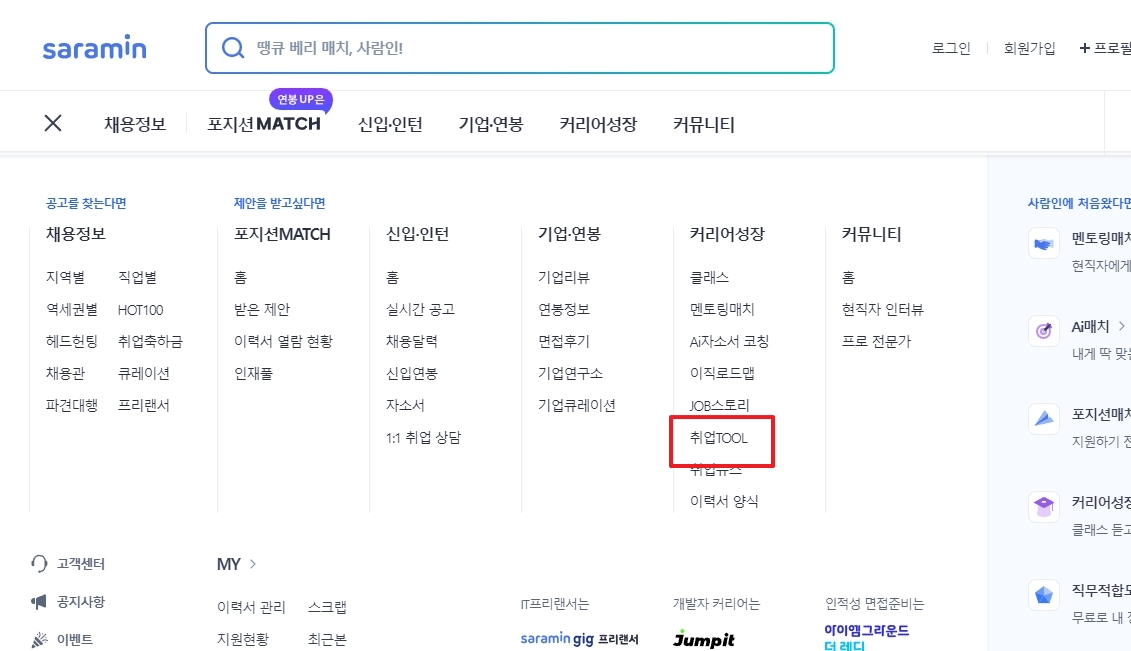 메뉴가 열리면 커리어성장 섹션 아래에 있는 취업tool을 클릭합니다. 이 옵션을 선택하면 사용자는 취업과 관련된 다양한 도구와 자료에 접근할 수 있으며, 자신의 커리어를 성장시키기 위한 유용한 정보를 얻을 수 있습니다.