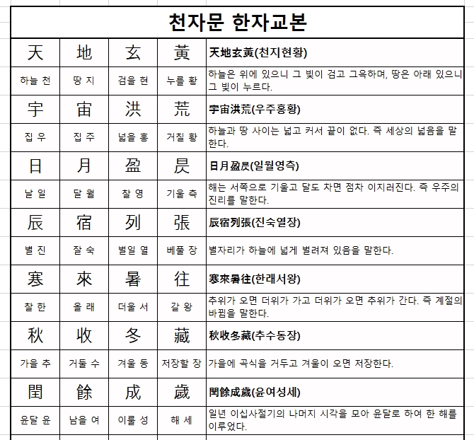 천자문 한자 교본 순서