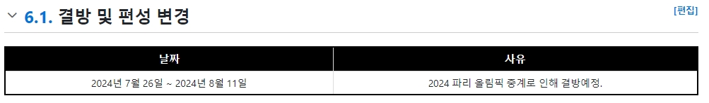 드라마는 2024 파리 올림픽 중계로 인해 2024년 7월 26일부터 8월 11일까지 잠시 결방될 예정입니다; 이는 큰 스포츠 이벤트가 진행되는 동안 일시적으로 방송 일정이 조정되는 경우가 많으며, 이를 통해 시청자들은 올림픽 중계를 즐길 수 있게 됩니다.