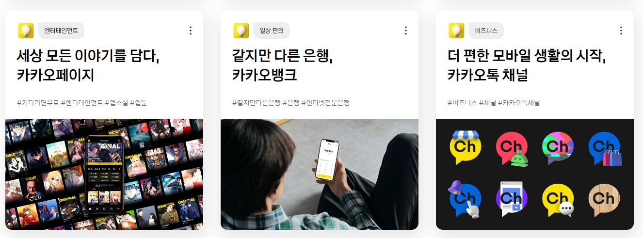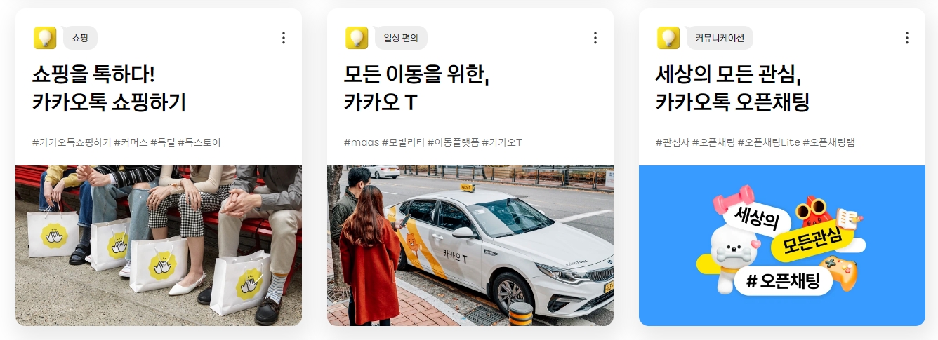 카카오는 일하는 방식의 변화를 추구합니다. 카카오비즈니스와 같은 플랫폼을 통해 사용자는 보다 쉽고 효율적인 업무 수행이 가능하며, 이를 통해 함께 일하는 즐거움을 발견할 수 있습니다. 이와 함께, 헤이카카오를 이용하면 말 한마디로 일상이 편리해지는 경험을 할 수 있으며, 카카오 이모티콘을 통해 새로운 소통의 언어를 만날 수 있습니다.