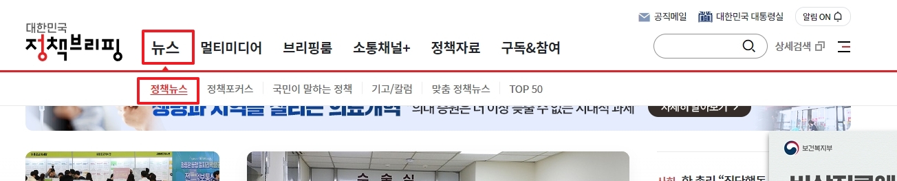 대한민국 정책브리핑 홈페이지에 들어갑니다. 이곳은 문화체육관광부 국민소통실이 운영하는 대한민국 정책 포털로, 다양한 부처의 정책 정보, 보도 자료, 해명 자료 등을 제공하는 공식 사이트입니다. 사용자는 이 사이트를 통해 국정과제와 정부의 다양한 소식을 확인할 수 있습니다.