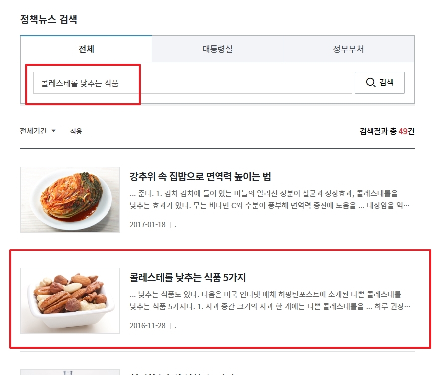 홈페이지의 상단 메뉴에서 뉴스 섹션으로 들어가 정책뉴스를 클릭합니다. 여기서 콜레스테롤 낮추는 식품을 검색하면 관련된 다양한 기사와 정보들이 나타납니다. 이중에서 관심 있는 글을 선택해 자세한 내용을 확인할 수 있으며, 여러 글을 읽어보는 것이 더 도움이 될 것입니다.