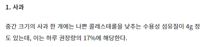 사과는 나쁜 콜레스테롤(LDL)을 낮추는데 효과적인 과일 중 하나입니다. 중간 크기의 사과 한 개에는 나쁜 콜레스테롤을 낮추는데 도움이 되는 수용성 섬유질이 약 4g 포함되어 있어, 이는 하루 권장량의 약 17%에 해당합니다.