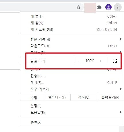 PC에서는 크롬 브라우저를 예로 들겠지만, 파이어폭스나 인터넷 익스플로러 등 대부분의 브라우저에서 비슷한 방식으로 글자 크기를 조절할 수 있습니다. 우측 상단에 위치한 메뉴 버튼(점 세 개)을 클릭하여 설정 메뉴로 들어갑니다.