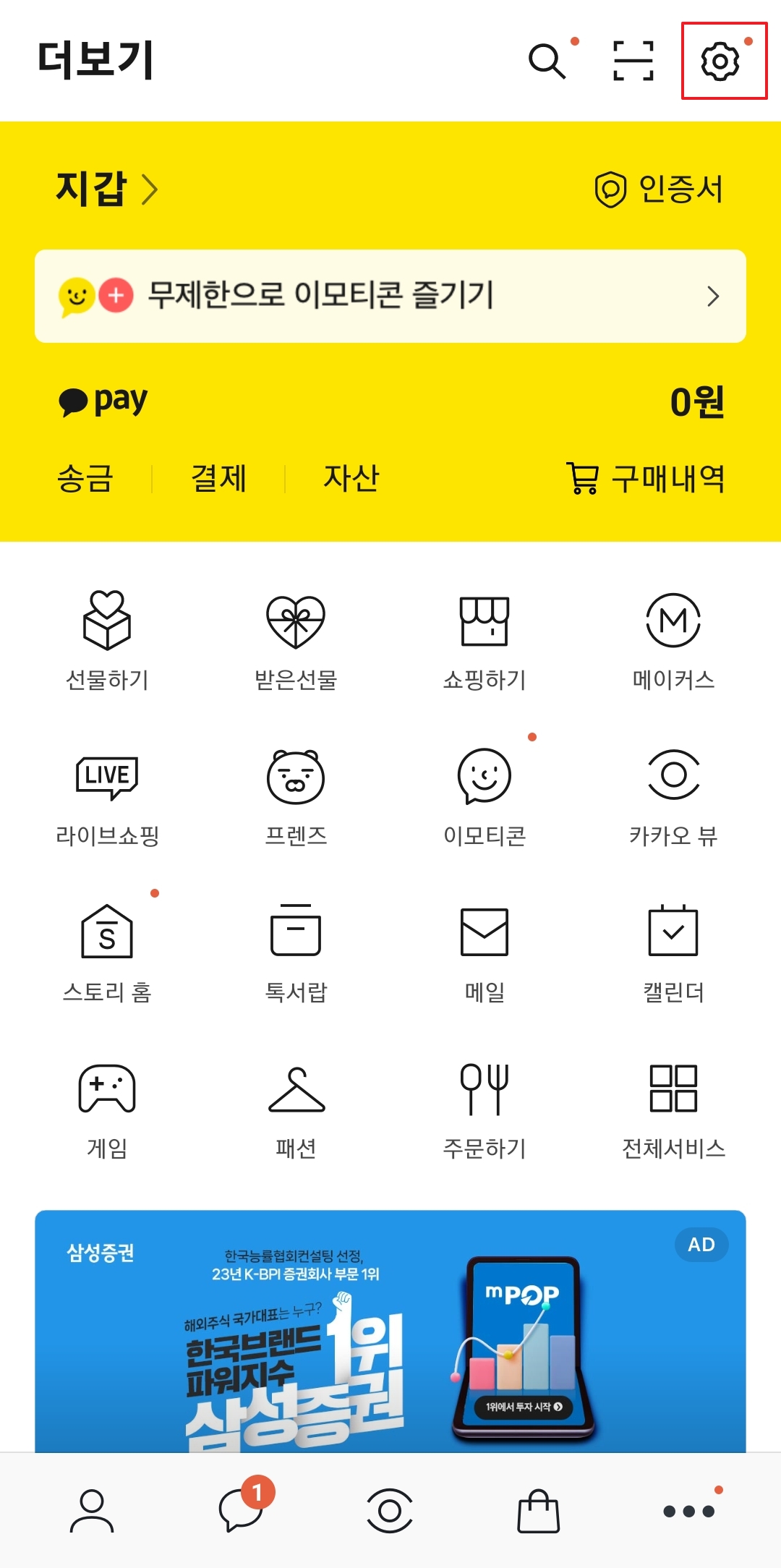 차단 조치가 완료된 후, 카카오톡의 주 대화 목록 화면으로 돌아와서 우측 하단에 있는 점 세 개가 배치된 메뉴 버튼을 클릭합니다. 이 버튼을 누르면 추가 옵션을 볼 수 있는 더보기 메뉴로 이동하게 됩니다. 더보기 메뉴에서 설정에 접근하려면 우측 상단에 있는 톱니바퀴 모양의 설정 아이콘을 클릭합니다. 이렇게 하면 카카오톡의 전반적인 설정을 할 수 있는 메뉴로 이동하게 됩니다.