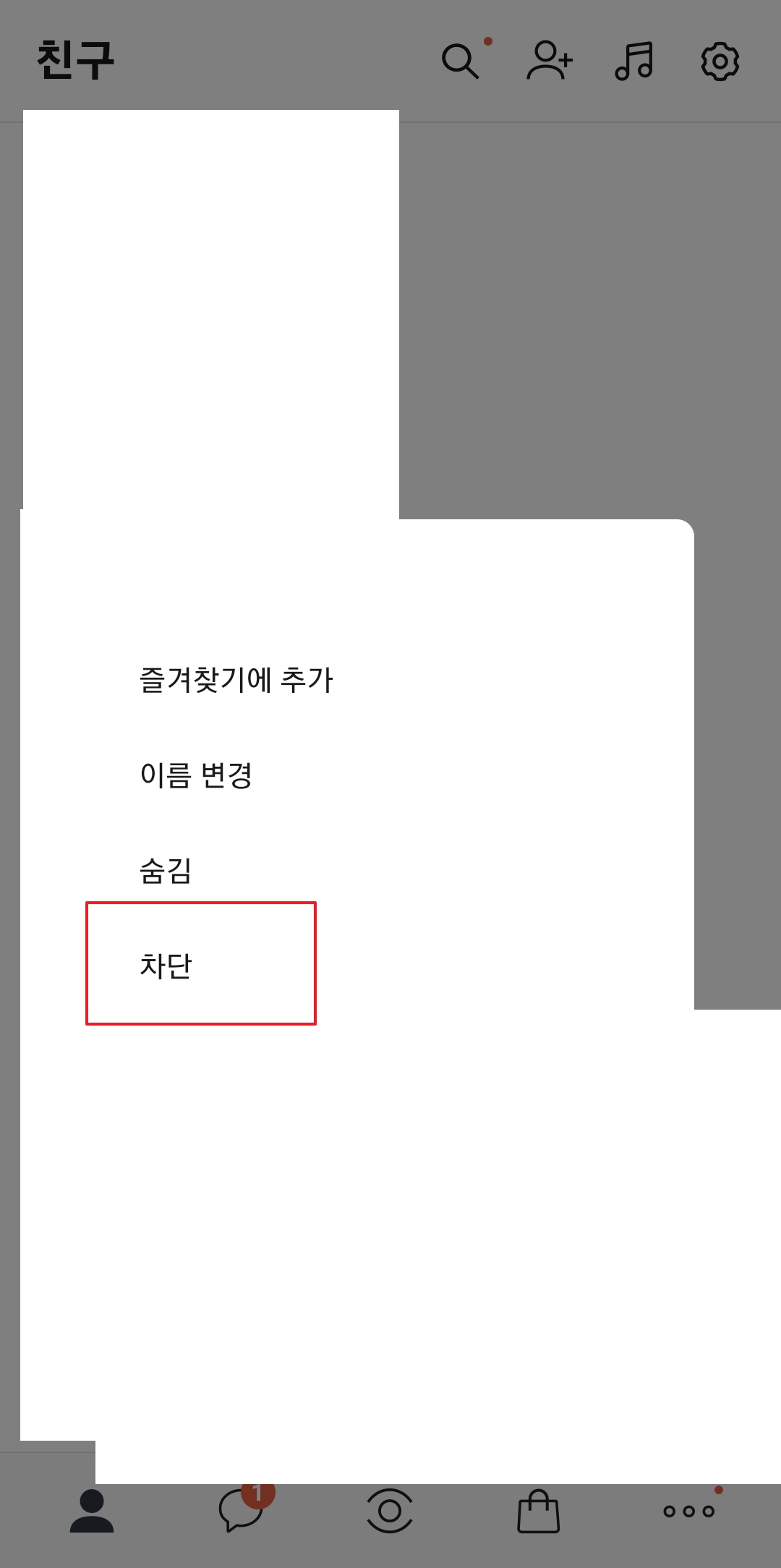 카카오톡 애플리케이션을 실행한 후, 친구 목록에서 삭제하고자 하는 친구를 길게 누릅니다. 몇 초간 해당 친구를 꾹 누르면, 팝업되는 메뉴 창에서 여러 옵션이 제시되는데, 여기서 차단 버튼을 선택하여 진행합니다.