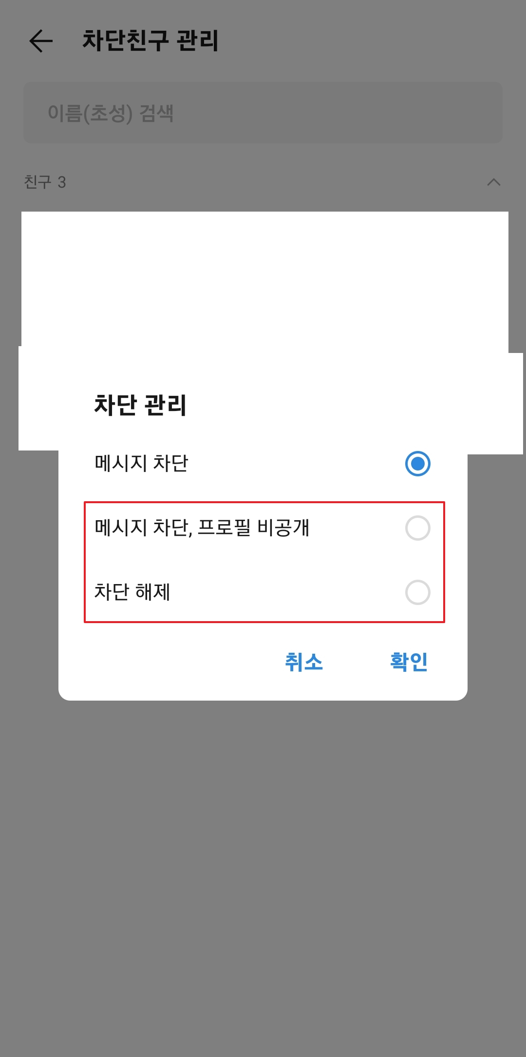 차단을 선택하면 차단 관련 설정이 있는 새 창으로 이동합니다. 이곳에서는 메시지를 차단할지, 프로필을 비공개로 설정할지를 결정할 수 있는데, 우선 메시지 차단을 선택하고, 확정 짓기 위해 차단 버튼을 다시 클릭합니다.