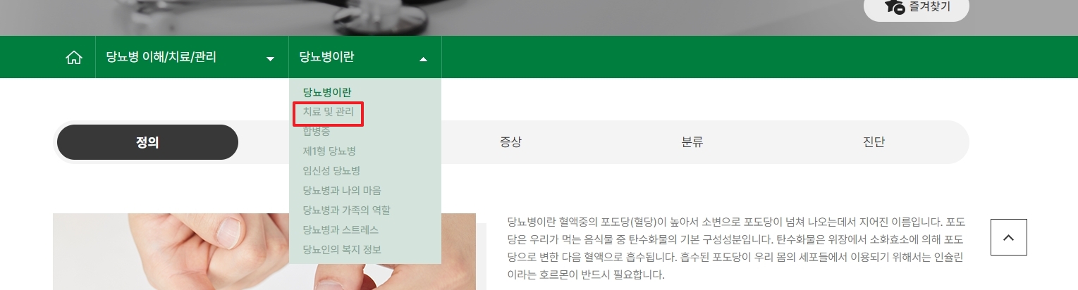 당뇨병의 이해/치료/관리 메뉴에 접근하여 당뇨병이란 메뉴를 클릭하면, 당뇨병의 기본적인 개념부터 치료 및 관리 방법에 이르기까지 상세한 정보를 제공합니다. 이러한 구성은 사용자들이 당뇨병에 대해 체계적으로 이해하고, 질병 관리에 필요한 실질적인 조치를 취하는 데 도움을 줍니다.