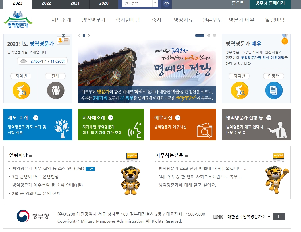 병역명문가 홈페이지 (www.mma.go.kr/hall/index.do)