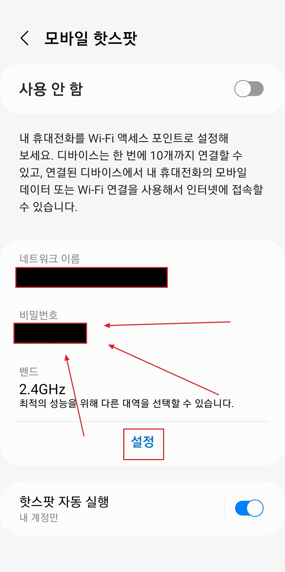 모바일 핫스팟 글자 부분을 클릭하여 상세 설정으로 이동합니다. 여기에서는 모바일 핫스팟의 비밀번호를 직접 볼 수 있으며, 설정이라는 파란색 글씨를 클릭하여 비밀번호 설정 창으로 이동할 수 있습니다. 이 페이지에서는 모바일 핫스팟의 이름, 보안 옵션, 비밀번호 등을 설정하거나 변경할 수 있습니다.