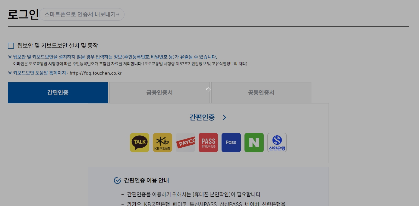홈페이지 메인화면에서 좌측 하단에 위치한 착한운전 마일리지 메뉴를 클릭합니다. 로그인 과정이 필요한데, 사용자는 간편인증이나 공동인증서 등 다양한 방법으로 로그인할 수 있습니다. 이 과정은 사용자의 신원을 확인하고, 신청 절차를 개인화하기 위해 필수적입니다.