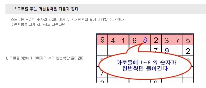 가로줄에 대한 규칙은 9개의 칸 모두에 1부터 9까지의 숫자가 한 번씩만 들어가야 합니다. 이는 스도쿠 게임의 기본 중의 기본이며, 플레이어는 이 규칙을 염두에 두고 숫자를 배치해야 합니다.
