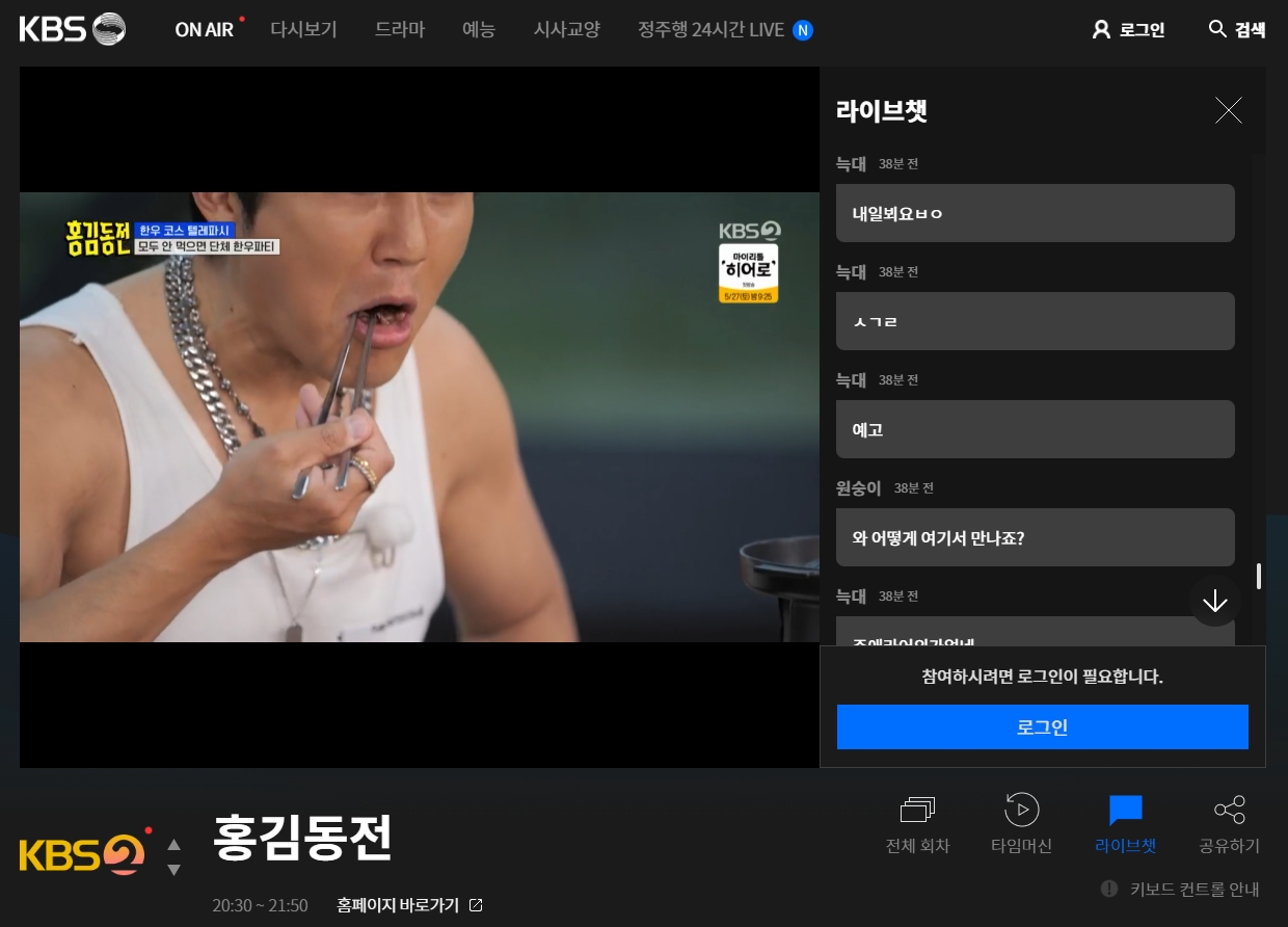 홈페이지의 On Air 버튼을 클릭하면, KBS1을 비롯한 실시간 방송을 시청할 수 있는 페이지로 넘어갈 수 있습니다.