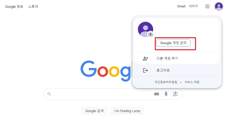 구글 홈페이지에 접속하여 우측 상단에 위치한 내 프로필을 클릭한 후 google 계정 관리 버튼을 클릭합니다. 만약 아직 로그인이 되어 있지 않다면, 찾으려는 핸드폰에 로그인된 구글 계정과 동일한 아이디로 로그인해야 합니다. 이 단계는 구글 계정을 통한 핸드폰 위치 추적을 위한 초기 접근 과정입니다.