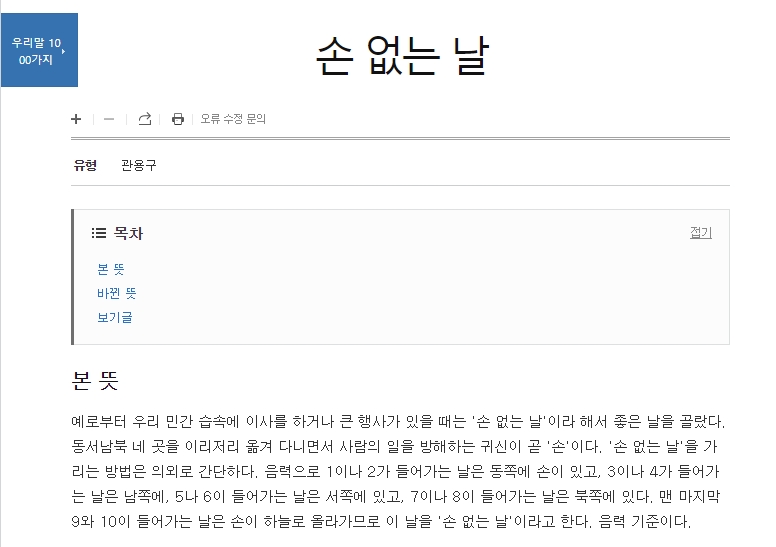 다음백과 홈페이지에 들어가서 손 없는 날에 대해 검색해 보았습니다. 이곳은 다양한 주제에 대한 깊이 있는 정보를 제공하는 사이트로, 특히 전통문화와 관련된 내용을 찾기에 매우 유용했습니다.