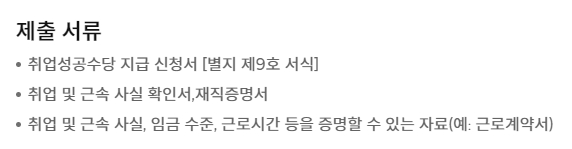 취업성공수당 지급 신청을 위해서는 취업성공수당 지급 신청서, 취업 및 근속 사실 확인서, 재직증명서, 근로계약서 등 취업 및 근속 사실, 임금 수준, 근로시간 등을 증명할 수 있는 자료가 필요합니다.