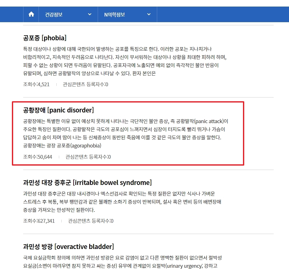 건강정보 섹션 내에서 N의학정보 페이지로 이동해 가나다 순으로 정렬된 메뉴에서 공황장애를 찾아 클릭했습니다. 이 페이지는 공황장애와 관련된 심층적인 정보를 제공하여, 이 질환에 대한 이해를 돕습니다.