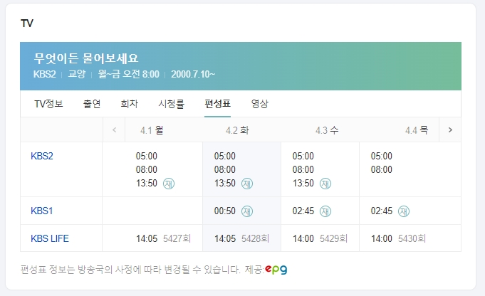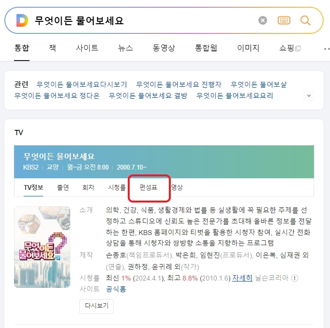 재방송을 찾기 위해서는 다음 포털 사이트에서 무엇이든 물어보세요를 검색하고, 프로그램 정보 내에 있는 편성표를 확인할 수 있습니다.