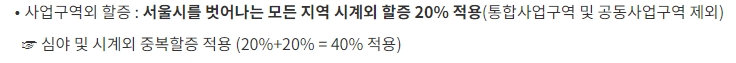서울시 바깥으로 이동할 경우 시계외 할증이 적용되어 20%의 추가 요금이 발생합니다. 이는 통합사업구역 및 공동사업구역을 제외한 모든 지역에서 적용되며, 심야 할증과 시계외 할증이 중복되는 경우에는 최대 40%까지 할증이 적용될 수 있습니다.