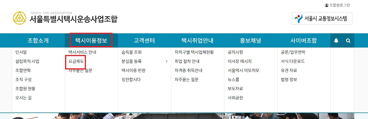 홈페이지 내에서 택시 이용과 관련된 요금제도를 알고 싶다면, 상단 메뉴의 택시이용정보에서 요금제도를 클릭하여 상세 정보를 확인하실 수 있습니다.
