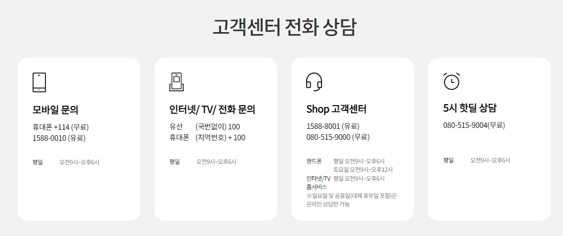 페이지의 가장 하단에는 고객센터의 전화 상담 번호가 안내되어 있습니다. 모바일 문의의 경우 +114(무료) 혹은 1588-0010(유료)로 연락할 수 있고, 인터넷/TV/전화 문의는 유선으로 (국번없이) 100번, 휴대폰에서는 지역번호를 붙여서 +100번으로 연결됩니다. 상담 가능 시간은 평일 오전 9시부터 오후 6시까지입니다. Shop 고객센터는 1588-8001(유료), 080-515-9000(무료)로 연결되며, 토요일은 오전 9시부터 오후 12시까지입니다. 홈서비스도 동일한 시간대에 상담 가능하고, 5시 핫딜 상담은 080-515-9004(무료)로 연결됩니다. 일요일 및 공휴일에는 온라인 상담만 가능하다고 하네요.