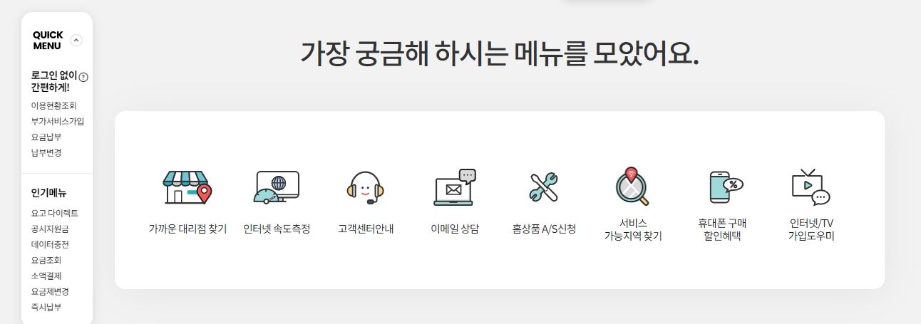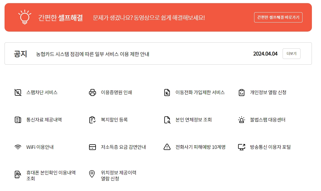 인터넷, TV, 전화 서비스 관련 고장에 대한 자가진단 페이지도 제공하네요. 상담원과의 대화 없이도 문제를 해결할 수 있도록 도와주는 것이 편리하긴 하지만, 실제로 문제를 해결할 수 있느냐가 중요하겠죠.