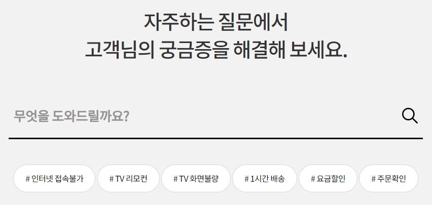 고객지원 메뉴를 클릭하면, 사용자들이 자주 찾는 메뉴들을 모아 놓은 페이지가 나타나는데, 이곳에서는 고객들이 직접 문제를 해결할 수 있는 방법을 우선 제시하는 듯합니다.