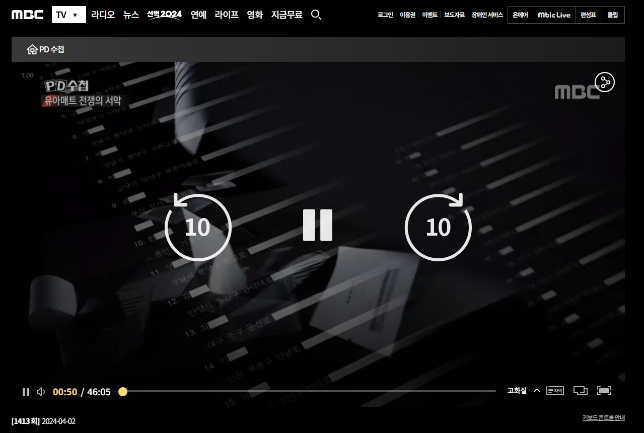 원하는 회차를 선택하면 해당 영상을 재생할 수 있으며, 비디오가 정상적으로 재생되는 것을 확인할 수 있습니다. 이는 대부분의 교양 프로그램이 MBC에서 유료로 제공되는 것과 대조적으로 PD수첩만의 특별한 무료 제공 정책을 반영한 것입니다.