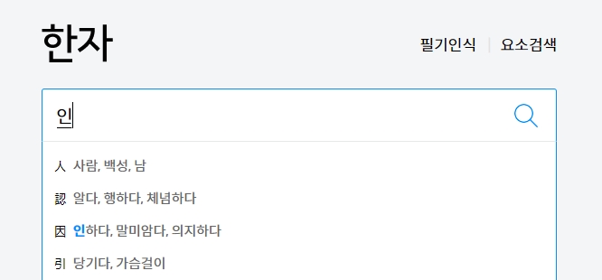 인이라는 한자로 검색을 하면 사람 인, 어질 인, 당길 인, 인할 인, 도장 인 등 그 한자를 포함한 여러 단어들이 결과로 제시됩니다.