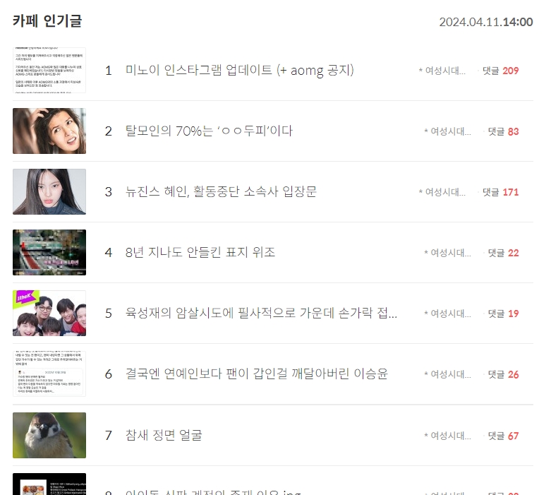 메인 화면을 보면 현재 인기 있는 카페의 제목들이 보여지는데, 이 목록은 실시간으로 업데이트되어 사용자들이 어떤 주제나 이슈가 화제인지를 한눈에 볼 수 있게 해줍니다. 다만, 모든 사용자에게 꼭 필요한 정보는 아닐 수도 있어요.