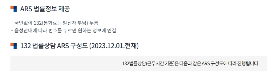 ARS 법률정보 제공도 확인했습니다. 132를 누르고 음성 안내에 따라 번호를 선택하면 원하는 법률 정보에 접속할 수 있었습니다. 이 서비스는 현재도 유지되고 있었습니다.
