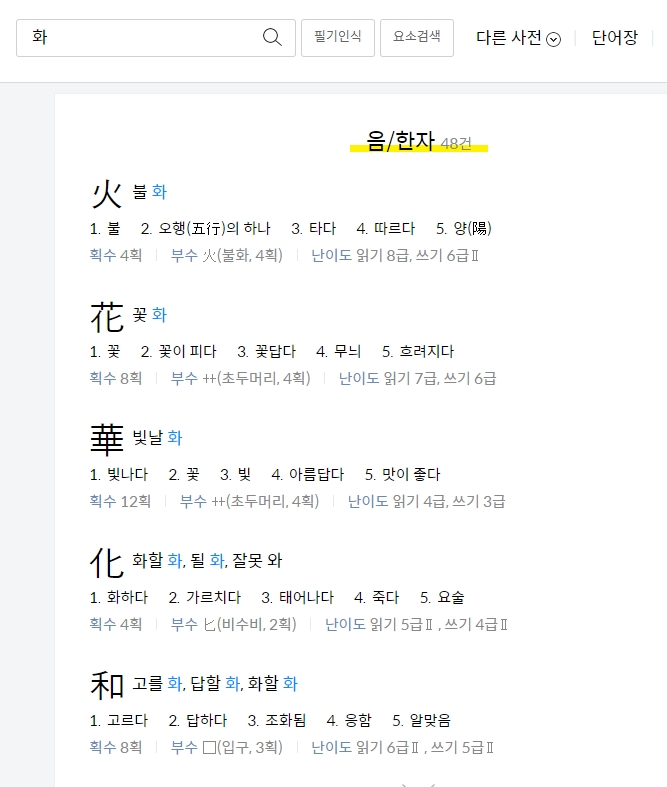 한글로 한자를 찾고자 할 때는 불 또는 화와 같은 키워드로 검색하면 관련 한자 목록을 조회할 수 있으며, 이 중에서 원하는 한자를 선택하여 그 의미를 확인할 수 있습니다.