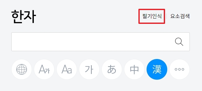 홈페이지의 검색창 우측 상단에 있는 필기 인식 기능을 활용하면, 마우스 또는 터치 입력으로 직접 한자를 그리고 검색할 수 있습니다.