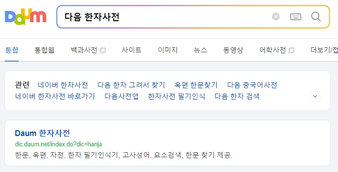 다음 한자사전 홈페이지에 접속합니다. 다음 한자사전은 다양한 검색 기능을 제공하며, 한자에 관한 포괄적인 정보를 얻을 수 있는 사이트입니다.