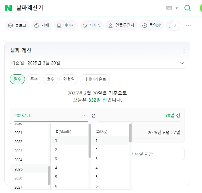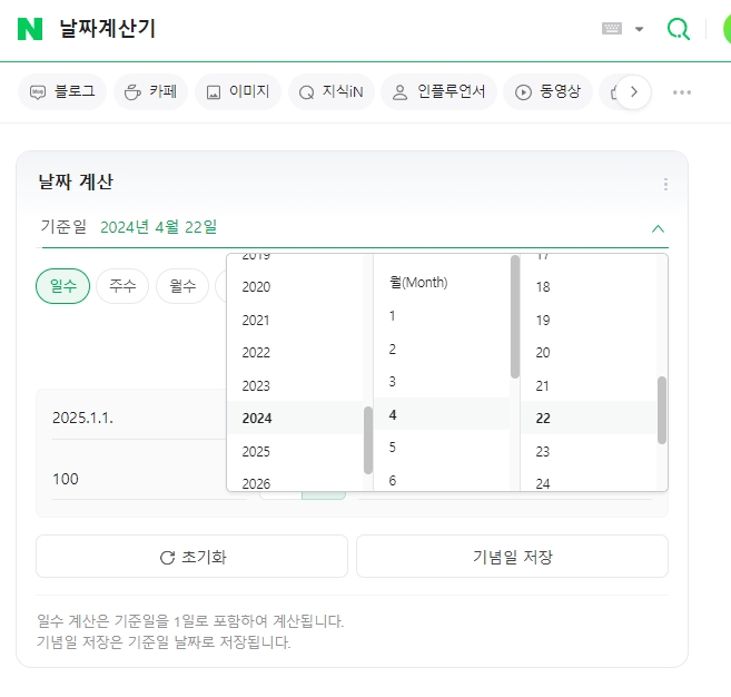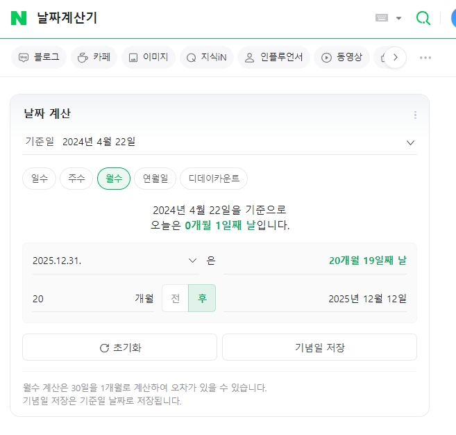 네이버에서 날짜 계산기를 검색하면 바로 날짜 계산 페이지에 접근할 수 있습니다. 이 페이지에서는 기준일을 설정하고, 기준일로부터 오늘이 며칠째인지, 특정 년월일이 몇 번째 날인지 확인할 수 있으며, n일 전이나 n일 후 등의 계산도 가능합니다.
