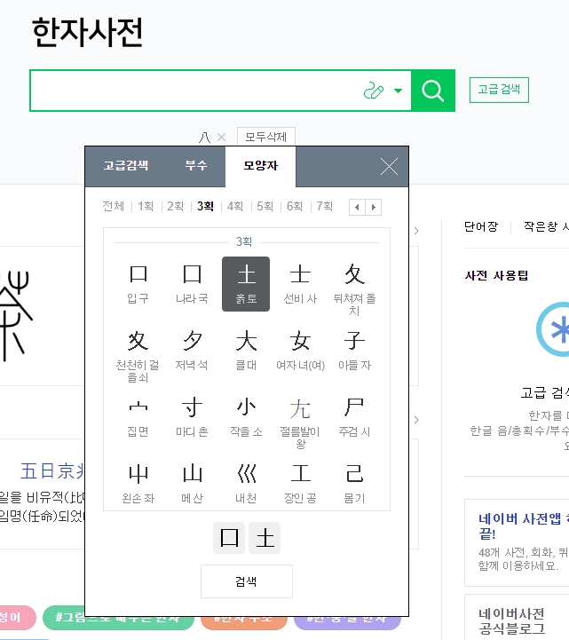 다른 예로, 모양자를 사용하여 검색해 보았습니다. 이 경우에는 최대 2개의 모양자를 선택할 수 있으며, 저는 입구와 흙토를 선택하여 검색을 시도했습니다. 이렇게 하면 선택한 모양자를 포함하는 한자들을 검색할 수 있습니다.