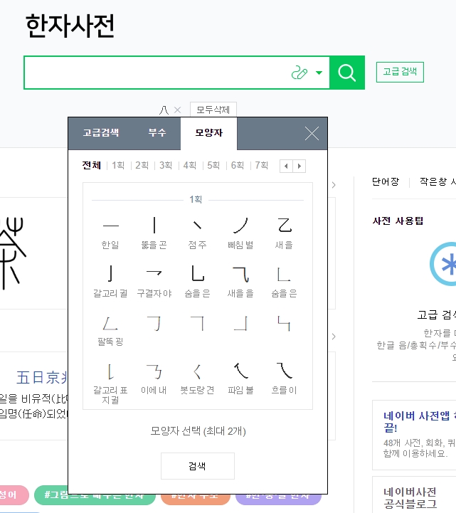 한자를 부수로 찾고자 할 때는 한자사전 페이지에서 고급 검색을 클릭합니다. 그러면 검색창 아래 작은 창이 열리며 여기에서 원하는 부수를 선택할 수 있습니다.