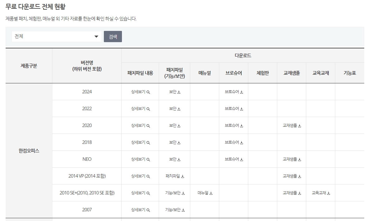 다운로드 전체보기 페이지로 이동하면, 여기에서 한컴오피스 2024 뷰어 같은 인기 다운로드 항목을 볼 수 있습니다. 다른 많은 제품들은 유료로 제공되고 있습니다.