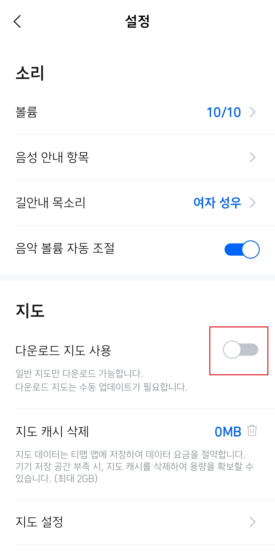 설정 창의 우측 상단에 있는 톱니바퀴 모양 아이콘을 클릭하여 추가 설정 메뉴로 들어갑니다. 여기서 지도 메뉴를 찾아보면 다운로드 지도 사용 옵션이 회색으로 표시되어 있음을 확인할 수 있습니다. 이 옵션을 클릭하면 다운로드 지도 기능이 활성화됩니다.