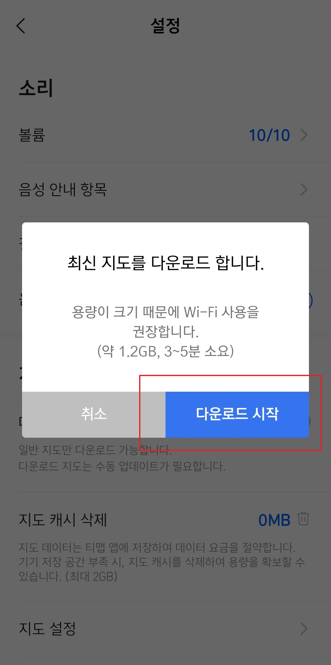 다운로드 지도 기능이 활성화된 후 다운로드 시작 버튼을 클릭합니다. 이 버튼을 통해 지도 데이터의 다운로드가 시작되며, 다운로드 속도는 현재 인터넷 연결 상태에 따라 다를 수 있습니다.