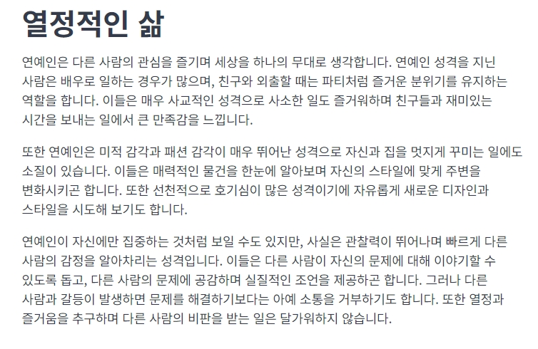 예를 들어, ESFP (연예인) 유형은 즉흥적으로 노래하고 춤을 추며 즐거움을 추구하는 성격을 가지고 있으며, 다른 사람들도 자신과 같은 즐거움을 느낄 수 있기를 바랍니다.