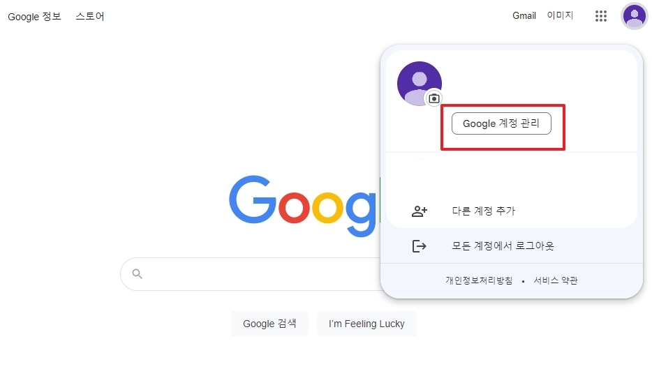메인화면에서 우측 상단에 위치한 개인 프로필 아이콘을 클릭합니다. 이후 팝업 창에서 Google 계정 관리를 선택하여 계정 관련 세부 설정으로 이동할 수 있습니다.