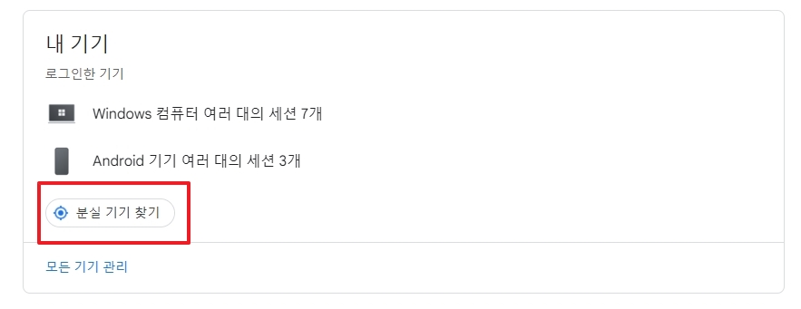 보안 탭의 하단으로 스크롤을 내리다 보면 내 기기 찾기 메뉴를 찾을 수 있습니다. 이 버튼을 클릭하면 사용자의 구글 계정에 등록된 기기들을 볼 수 있는 페이지로 넘어갑니다.