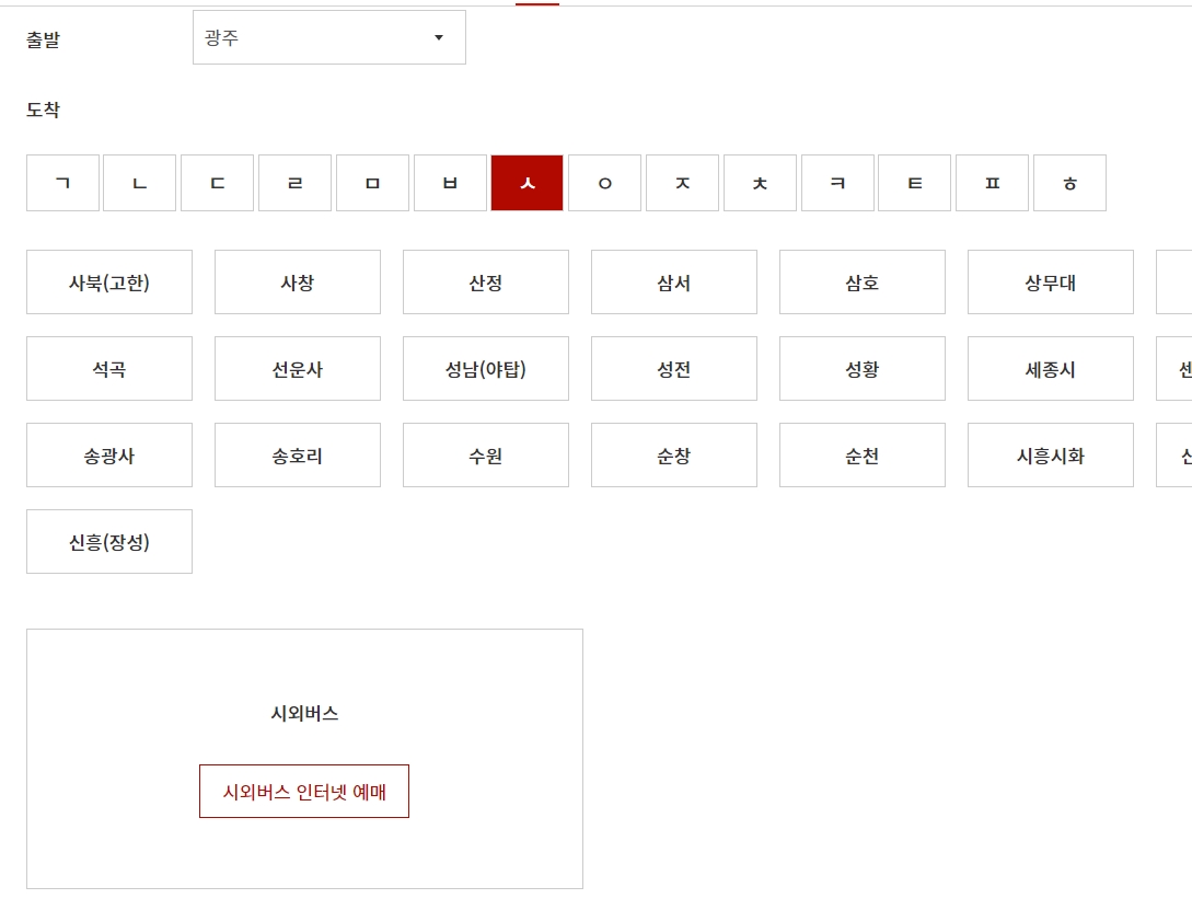 승차권 예약 페이지에서 출발지는 기본적으로 광주로 설정되어 있습니다. 도착지는 한글 가나다 순으로 정렬된 목록에서 선택할 수 있습니다.