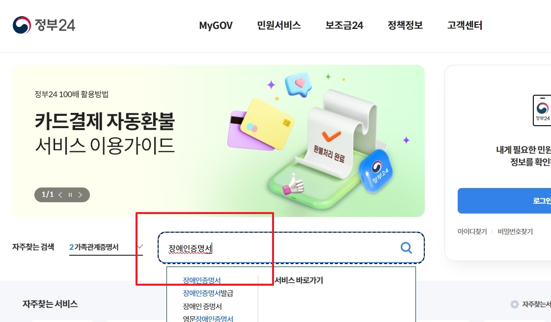 홈페이지 검색창에 장애인증명서를 검색했습니다. 민원서비스 검색 결과 중에서 장애인증명서 발급을 클릭했습니다.