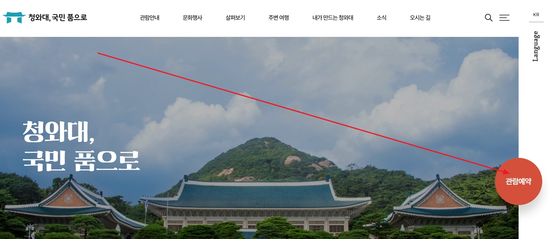 청와대 국민품으로 홈페이지로 들어갔습니다. 이곳에서 관람 예약, 예약 조회, 사전 예약제 운영, 관람일 안내 등을 확인할 수 있습니다.