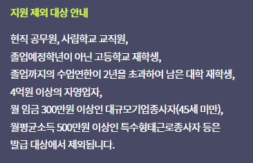 지원 제외 대상도 안내합니다. 현직 공무원, 사립학교 교직원, 졸업예정학년이 아닌 고등학교 재학생, 졸업까지의 수업연한이 2년을 초과하여 남은 대학 재학생, 4억원 이상의 자영업자, 월 임금 300만원 이상인 대규모기업 종사자(45세 미만), 월평균소득 500만원 이상인 특수형태근로종사자 등은 발급 대상에서 제외됩니다.